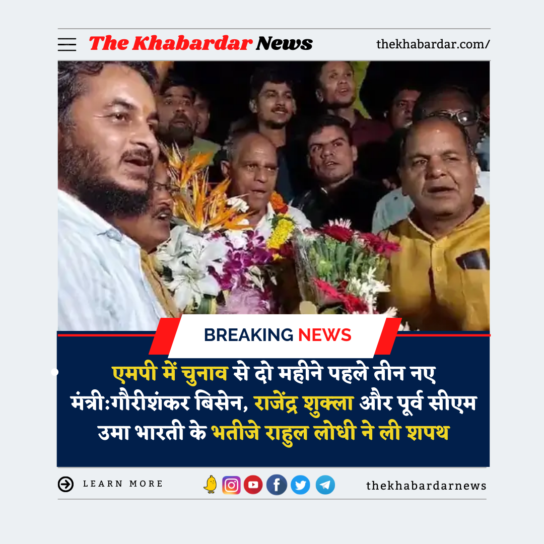 विधानसभा चुनाव से करीब दो महीने पहले शिवराज मंत्रिमंडल में शनिवार को 3 नए मंत्रियों को शामिल किया गया। तीनों को राज्यपाल मंगु भाई पटेल ने राजभवन में शपथ दिलाई। नए मंत्रियों में सबसे पहले महाकौशल से गौरीशंकर बिसेन, विंध्य से राजेंद्र शुक्ला और बुंदेलखंड से पूर्व मुख्यमंत्री उमा भारती के भतीजे राहुल लोधी ने शपथ ली। शिवराज कैबिनेट में अब 33 मंत्री हो गए हैं। 1 पद अब भी खाली है।