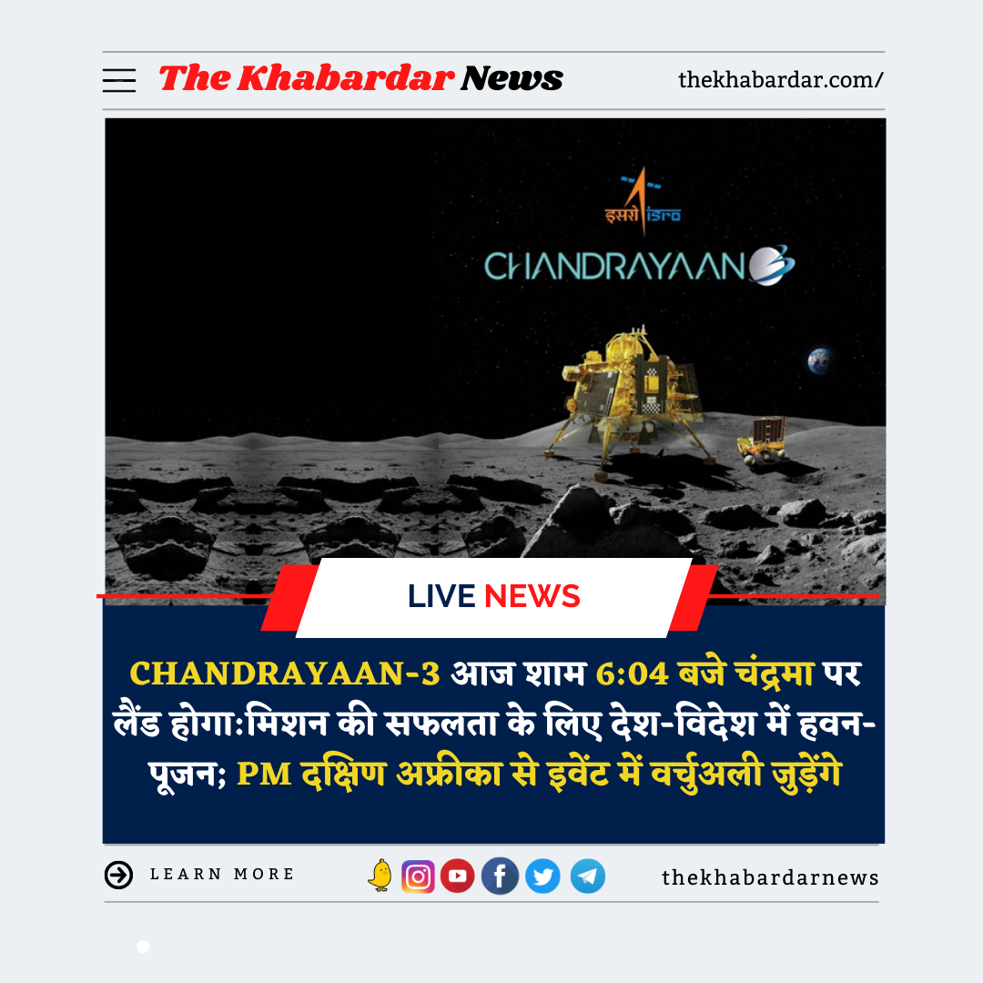लैंडिंग का लाइव इवेंट शाम 5:20 बजे से शुरू होगा। इस इवेंट में प्रधानमंत्री नरेंद्र मोदी भी वर्चुअली जुड़ेंगे। अभी वो साउथ अफ्रीका में हैं इसलिए वर्चुअली शामिल हो रहे हैं। वहीं मिशन की सफलता के लिए देश ही नहीं बल्कि विदेश में भी में जगह-जगह पर हवन कराए जा रहे हैं।