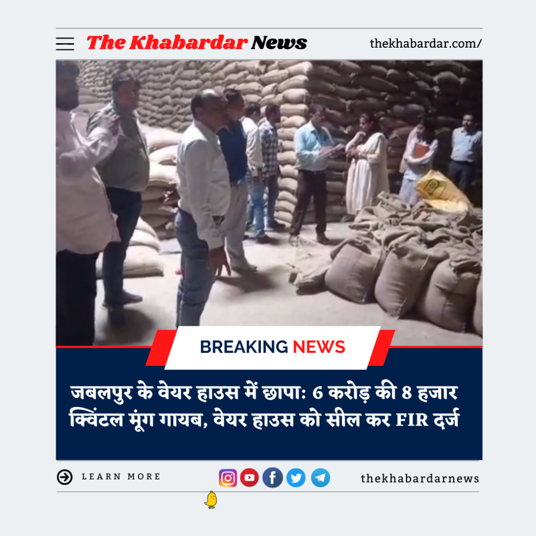 मध्य प्रदेश के जबलपुर से सियाराम वेयरहाउस से गंभीर मामला सामने आया है। वेयर हाउस में छापा मारा गया तो 8 हज़ार क्विंटल मूंग गायब मिली। इसमें 6 करोड़ से ज्यादा की गड़बड़ी की आशंका जताई गई है। कार्रवाई के दौरान वेयर हाउस को सील कर एफआईआर दर्ज की गई है।