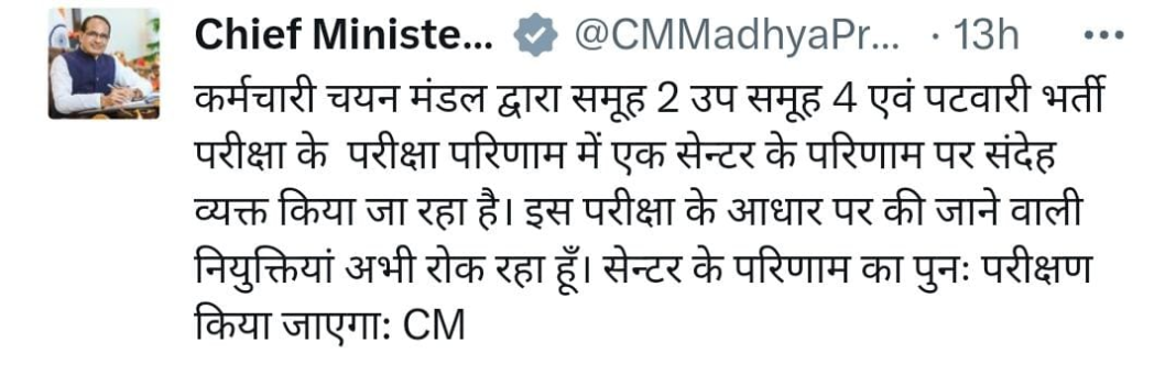 सीएम शिवराज सिंह चौहान ने बड़ा फैसला लेते हुए पटवारी भर्ती परीक्षा की नियुक्तियों पर फिलहाल रोक लगा दी है। उन्होंने ट्वीट कर इसकी जानकारी दी है। मुख्यमंत्री ने कहा, कर्मचारी चयन मंडल द्वारा समूह-2, उप समूह -4 एवं पटवारी भर्ती परीक्षा के परीक्षा परिणाम में एक सेंटर के परिणाम पर संदेह व्यक्त किया जा रहा है। इस परीक्षा के आधार पर की जाने वाली नियुक्तियां अभी रोक रहा हूं। सेंटर के परिणाम का पुनः परीक्षण किया जाएगा। पटवारी भर्ती परीक्षा परिणाम में धांधली को लेकर कांग्रेस के हमलावर होने के साथ ही परीक्षा में शामिल अभ्यर्थी भी सरकार के खिलाफ मैदान में उतर गए हैं। बड़ी संख्या में अभ्यर्थियों ने गुरुवार को भोपाल, इंदौर समेत अन्य शहरों में परीक्षा में गड़बड़ी की जांच की मांग को लेकर विरोध प्रदर्शन किया। भोपाल में प्रदर्शनकारियों ने सरकार को चेतावनी दी कि यदि सात में जांच नहीं कराई गई, तो वे भोपाल से दिल्ली तक आंदोलन करेंगे। इसकी जांच की मांग को लेकर पूर्व सीएम कमलनाथ, दिग्विजय सिंह और नेता प्रतिपक्ष गोविंद सिंह ने सीएम को पत्र भी लिखा था। कांग्रेस ने पूरे मामले में सीबीआई जांच की मांग की है। सूत्रों का कहना है कि अब भाजपा विधायक संजीव सिंह कुशवाह के कॉलेज के सेंटर के परिणाम को दोबारा परीक्षण किया जाएगा।