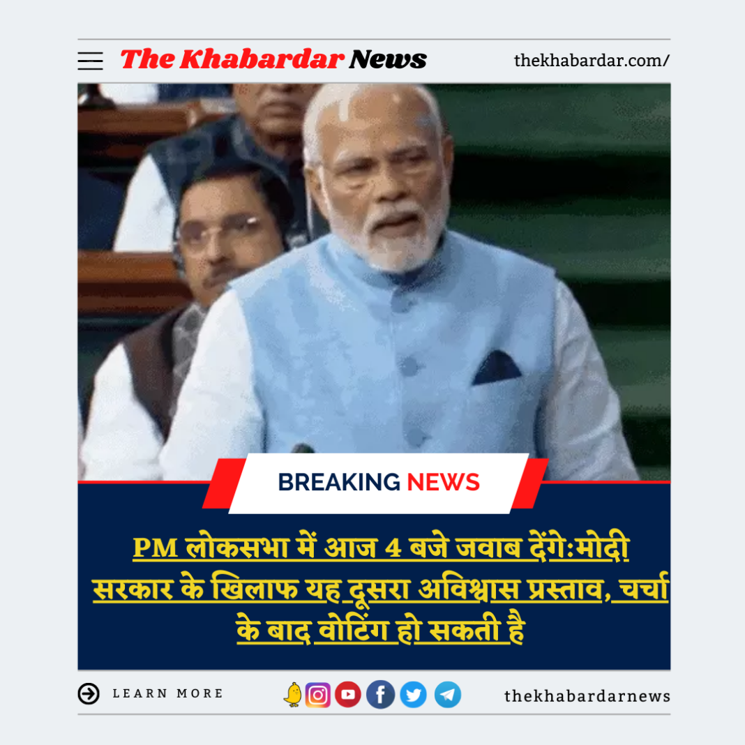 अविश्वास प्रस्ताव पर गुरुवार यानी 10 अगस्त को आखिरी दिन चर्चा होगी। प्रधानमंत्री नरेंद्र मोदी शाम 4 बजे जवाब देंगे। इसके बाद वोटिंग हो सकती है। बहुमत के लिए सदन में मौजूद सदस्यों में 50% से 1 अधिक होना चाहिए।