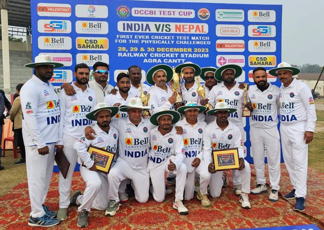 आगरा, उत्तर प्रदेश में दिव्यांग क्रिकेट कंट्रोल बोर्ड आफ इंडिया के सानिध्य में 28 से 30 दिसंबर तक आयोजित हुए पहले दिव्यांग टेस्ट मैच में भारत ने नेपाल को पराजित कर टेस्ट मैच अपने नाम किया. खास बात ये रही की आईआईटी इंदौर मे सीनियर असिस्टेंट के तौर पर पदस्थ, सतना के बृजेश द्विवेदी इस ऐतिहासिक टेस्ट मैच में कप्तान की भूमिका मे भारतीय टीम को एक पारी और 18 रन से विजय श्री दिलाई.