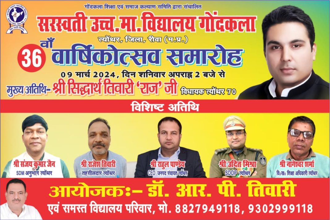 त्यौंथर तहसील के शिक्षा के क्षेत्र में अग्रणी स्थान रखने वाले सरस्वती उच्च. मा. विद्यालय गोदकला में आज 36वा वार्षिकोत्सव समारोह आज जिसमें त्योथर विधायक सिद्धार्थ तिवारी राज मुख्य अतिथि वही विशिष्ट के रूप में त्यौंथर एसडीएम संजय जैन, एसडीओपी उदित मिश्रा, जप. सीईओ राहुल पांडे,तहसीलदार राजेश तिवारी, बीईओ नागेश्वर शर्मा रहेंगे मौजूद.. विद्यालय संचालक डॉक्टर आरपी तिवारी ने छोटे छोटे बच्चो का उत्साहवर्धन करने को लेकर क्षेत्र के तमाम लोगों से 36वा वार्षिकोत्सव कार्यक्रम में पहुंचने की अपील